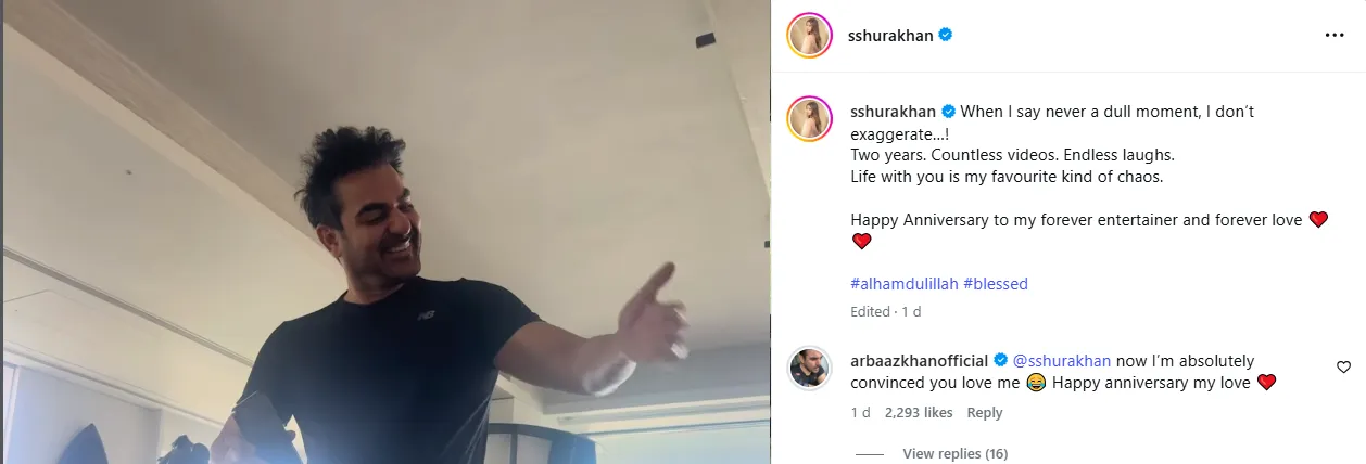 शूरा की इस प्यारी पोस्ट पर अरबाज ने रिप्लाई करते हुए लिखा, 'शूरा अब मुझे पूरा यकीन हो गया है कि तुम मुझसे प्यार करती हो. ' आगे अरबाज ने शूरा खान को सालगिरह की मुबारकबाद देते हुए लिखा, 'सालगिरह मुबारक हो मेरे प्यार. '