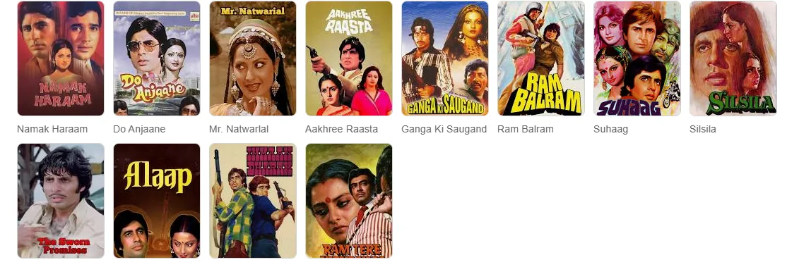 रेखा और अमिताभ बच्चन की जोड़ी बॉलीवुड की सबसे यादगार जोड़ियों में से एक है. जब भी ये दोनों पर्दे पर आए, दर्शकों ने उनके जादू को सराहा. दो अंजाने (1976), अलाप (1977), मुकद्दर का सिकंदर (1978), मिस्टर नटवरलाल (1979), और सिलसिला (1981) जैसी फिल्मों में उनकी केमिस्ट्री ने दर्शकों को मंत्रमुग्ध कर दिया.
