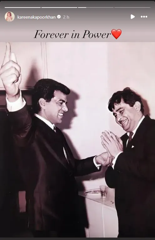 करीना कपूर ने अपने दादा राज कपूर और धर्मेंद्र की गले लगते हुए एक पुरानी तस्वीर शेयर की है. उन्होंने तस्वीर के साथ एक दिल वाला इमोजी लगाया. साथ ही लिखा — ‘Forever in Power’ और Chardi Kala’