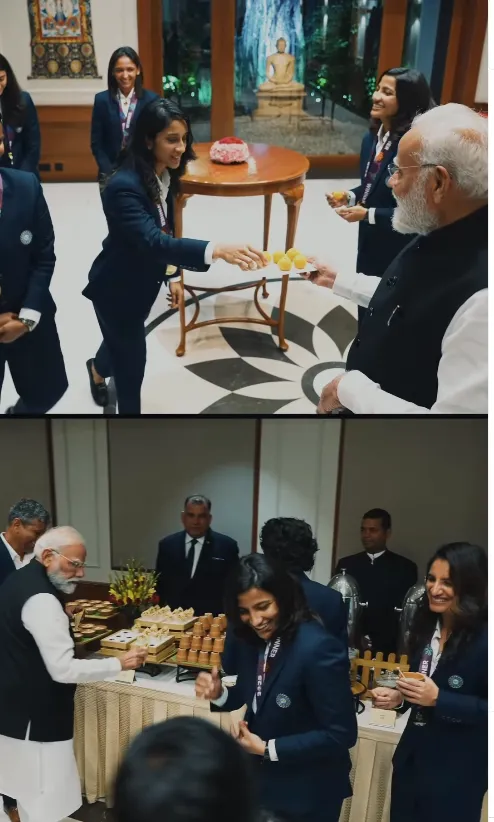 इस दौरान प्रधानमंत्री मोदी ने खिलाड़ियों को लड्डुओं की ट्रे भेंट की, जिसे देखकर सभी के चेहरे खिल उठे. टीम की सदस्याओं ने मिलकर लड्डू खाए और इस खास पल को मुस्कुराहटों और उत्साह के साथ साझा किया.