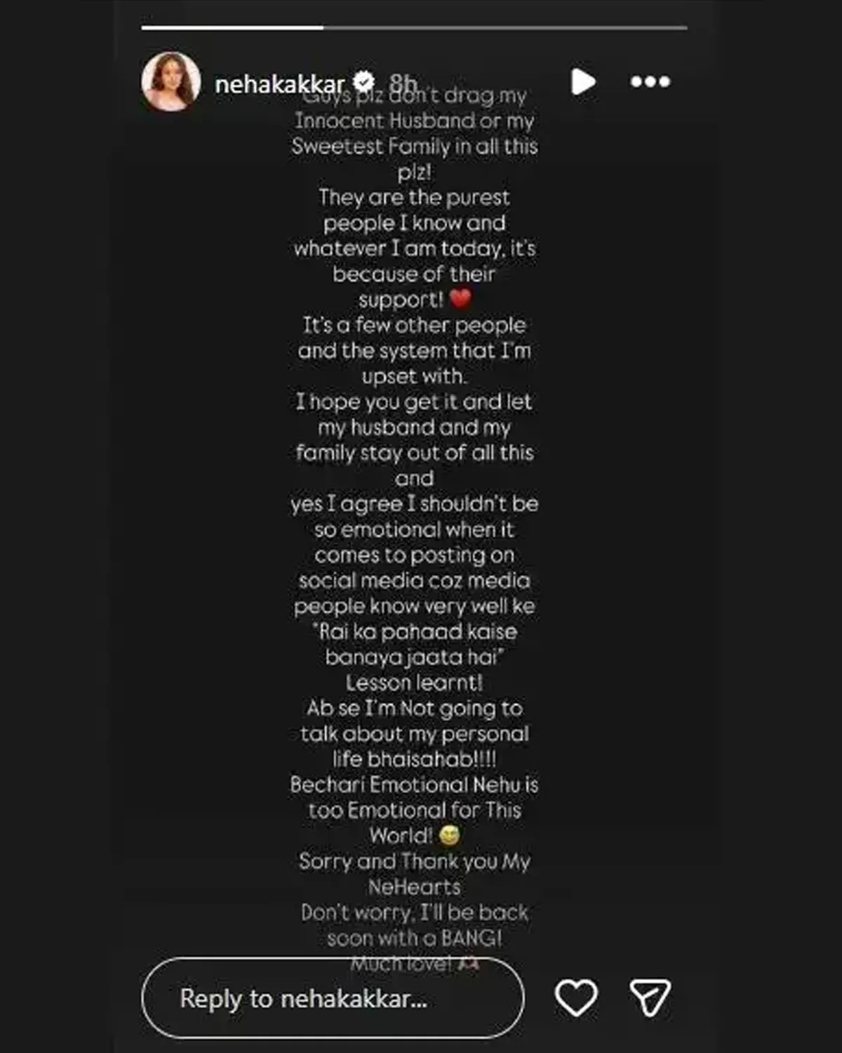 नेहा ने इंस्टाग्राम स्टोरी के जरिए कहा कि लोगों को उनके पति और परिवार को इस मामले में नहीं घसीटना चाहिए. उन्होंने साफ किया कि उनकी नाराजगी किसी और बात से है, पति से नहीं.