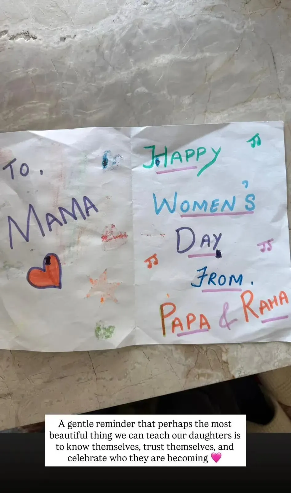 कार्ड पर लिखा था, “To Mama, Happy Women’s Day. From Papa & Raha.”