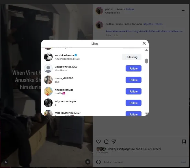 इस मज़ेदार रील (Virat kohli reel) को देखकर न केवल फैंस हंसी से लोटपोट हो गए, बल्कि खुद अनुष्का शर्मा ने भी इसे नोटिस किया और लाइक करके अपनी प्रतिक्रिया दी. अनुष्का का यह छोटा सा इशारा सोशल मीडिया पर बड़ा प्रभाव डाल गया और यह रील कुछ ही घंटों में वायरल हो गई.फैंस ने इस पर तरह-तरह के कमेंट्स किए. किसी ने लिखा, “हम भी तो उनके साथ थे यार!” तो किसी ने कहा, “विराट-फैन का दिल टूट गया, लेकिन मज़ेदार तरीके से.” वहीं कई यूज़र्स ने अनुष्का शर्मा की सेंस ऑफ ह्यूमर की तारीफ की और कहा कि वह हर चीज़ को पॉज़िटिव तरीके से लेती हैं.