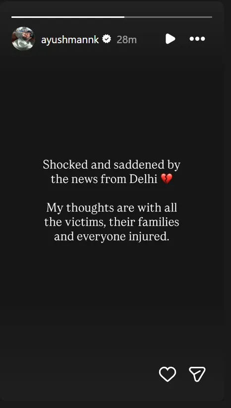 सामाजिक मुद्दों पर फिल्में बनाने के लिए मशहूर अभिनेता आयुष्मान खुराना ने इस हादसे पर गहरा दुख व्यक्त किया. उन्होंने अपनी इंस्टाग्राम स्टोरी पर लिखा —“दिल्ली से आई इस खबर को सुनकर बहुत दुखी और हैरान हूं. हादसे में जान गंवाने वालों और उनके परिजनों के प्रति मेरी संवेदनाएं हैं.”