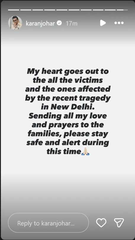 निर्माता-निर्देशक करण जौहर ने भी अपनी इंस्टाग्राम स्टोरी पर लिखा —“दिल्ली हादसे में जान गंवाने वालों और पीड़ितों के परिवारों के साथ मेरी गहरी संवेदनाएं हैं. कृपया सुरक्षित रहें और सतर्कता बरतें.”