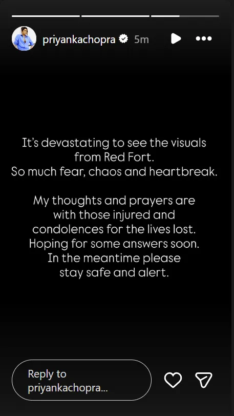 वैश्विक अभिनेत्री प्रियंका चोपड़ा ने भी दिल्ली धमाके पर दुख जताते हुए इंस्टाग्राम स्टोरी शेयर की. उन्होंने लिखा —“लाल किले से आए दृश्य देखकर दिल टूट गया. इतनी अफरा-तफरी और डर देखकर मन व्यथित है. इस हादसे में जान गंवाने वालों और घायलों के प्रति मेरी प्रार्थनाएं हैं. कृपया सुरक्षित रहें और सतर्क रहें.”