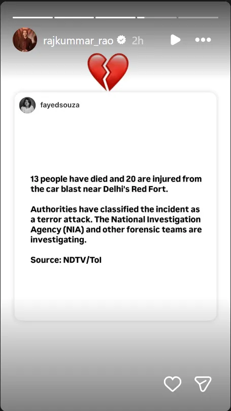 अभिनेता राजकुमार राव ने हादसे की खबर सुनकर अपनी इंस्टाग्राम स्टोरी पर दिल टूटने वाला इमोजी शेयर किया. उन्होंने लिखा —“दिल्ली धमाके में जान गंवाने वालों के परिवारों को शक्ति मिले, यही प्रार्थना है.”