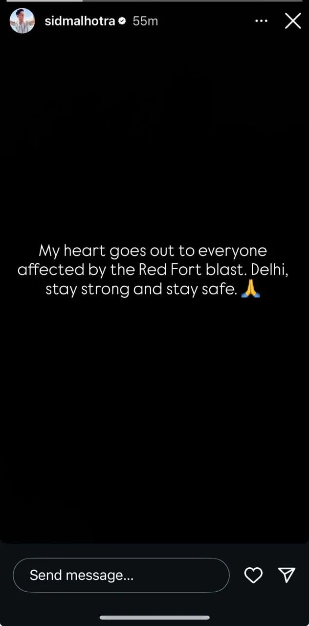 अभिनेता सिद्धार्थ मल्होत्रा ने लिखा —“लाल किला विस्फोट से प्रभावित सभी लोगों के प्रति मेरी संवेदनाएं हैं. दिल्ली, मजबूत रहो और सुरक्षित रहो.”