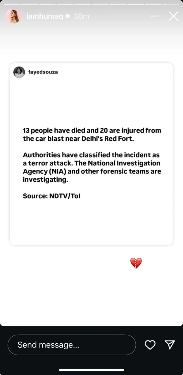 अभिनेत्री हुमा कुरैशी ने भी अपनी इंस्टाग्राम स्टोरी पर हादसे से जुड़ी पोस्ट शेयर की और दिल टूटने वाला इमोजी लगाया.