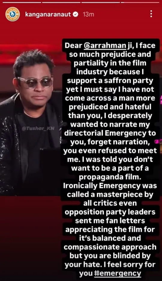 कंगना ने अपनी एक स्टोरी में लिखा,“रहमान जी, मुझे फिल्म इंडस्ट्री में एक भगवा पार्टी को सपोर्ट करने की वजह से बहुत ज्यादा पक्षपात का सामना करना पड़ता है, फिर भी मुझे कहना होगा कि मैंने आपके जैसा पूर्वाग्रही और नफरत करने वाला इंसान नहीं देखा.”