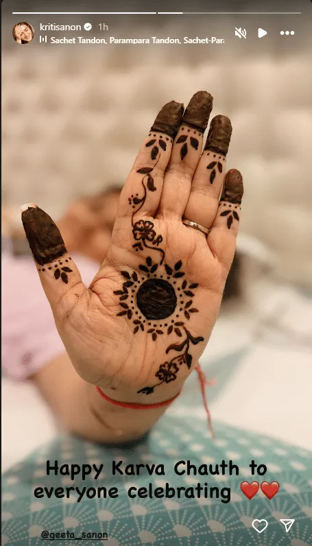 कृति ने इंस्टाग्राम स्टोरी पर अपनी मां के हाथों पर मेहंदी लगाते हुए एक प्यारी तस्वीर साझा की. तस्वीर के साथ उन्होंने लिखा, "मां की पर्सनल मेहंदी आर्टिस्ट से मिलिए! @geeta_sanon हैप्पी करवा चौथ! ❤️". इसके अलावा कृति ने मेहंदी के डिजाइन की क्लोज़-अप तस्वीर भी शेयर की, जिसमें मेहंदी का खूबसूरत पैटर्न साफ दिखाई दे रहा था. उन्होंने सभी को करवा चौथ की शुभकामनाएं भी दी और लिखा, "सभी को करवा चौथ की बधाई."कृति का यह अंदाज दर्शाता है कि वह अपनी मां के लिए कितनी संवेदनशील और प्यार भरी बेटी हैं. फैंस ने इस पोस्ट पर कृति की तारीफ की और उन्हें इस खास मौके के लिए बधाई दी.