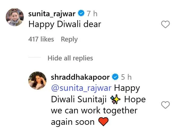 श्रद्धा के इस पोस्ट पर कई सेलिब्रिटीज़ ने भी कमेंट किए.अभिनेत्री सुनीता राजवार ने उन्हें बधाई देते हुए लिखा —“दिवाली मुबारक हो.”इस पर श्रद्धा ने जवाब दिया —“दिवाली मुबारक हो सुनीता जी, उम्मीद है कि हम दोनों फिर से साथ काम कर सकें.”बता दें कि दोनों ने पहले ‘स्त्री’ (2018) फिल्म में साथ काम किया था, जो मैडॉक फिल्म्स के हॉरर-कॉमेडी यूनिवर्स का हिस्सा है.श्रद्धा की ‘स्त्री’ और सुनीता राजवार की भूमिका दोनों ही दर्शकों को खूब पसंद आई थीं.