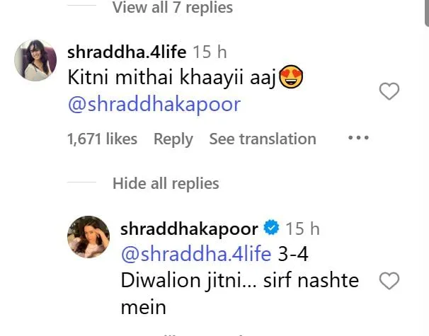 जहां एक तरफ लोग श्रद्धा की खूबसूरती की तारीफ कर रहे थे, वहीं एक फैन ने उनसे मजेदार सवाल पूछ लिया —“आपने दिवाली पर कितनी मिठाई खाई आज?”श्रद्धा ने भी पूरे मस्त अंदाज में जवाब दिया,“तीन-चार दिवालियों जितनी, सिर्फ नाश्ते में.”उनका यह जवाब फैंस को इतना पसंद आया कि कमेंट सेक्शन में हंसी का माहौल बन गया.एक यूजर ने लिखा —“इतना क्यूट दिखना अलाउड है क्या?”जिस पर श्रद्धा ने फिर जवाब दिया —“सिर्फ मुझे और स्मॉल को अलाउड है.”(‘स्मॉल’ उनके प्यारे डॉग का नाम है) एक अन्य फैन ने लिखा —“बस आपके ही पोस्ट का इंतजार था, अब हो गई हमारी दिवाली!”